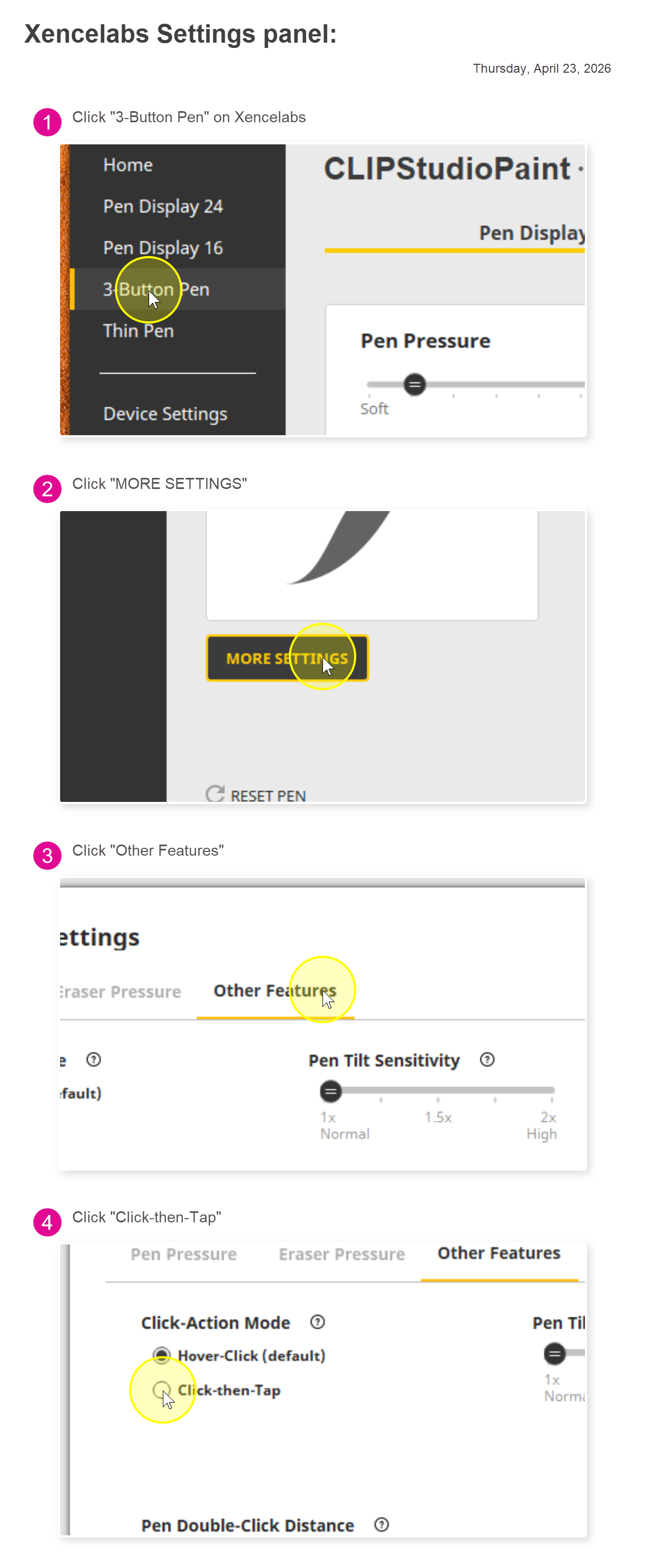 There is a setting in the Xencelabs Settings panel > {select the pen you are using} 3-Button pen > More Settings > Other Settings > for Click-Action Mode to be set to Hover or Click -then-Tap. Is this what you are wanting to change?