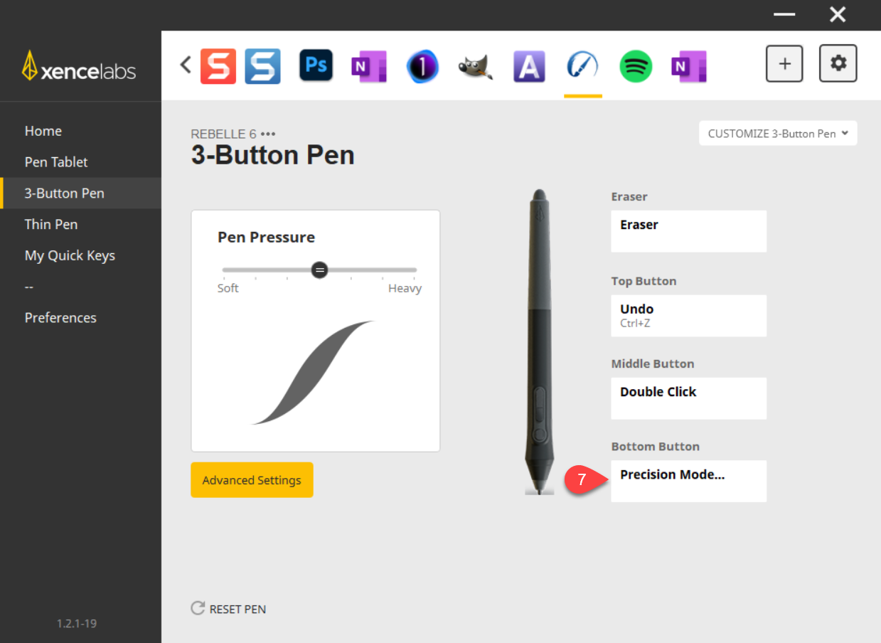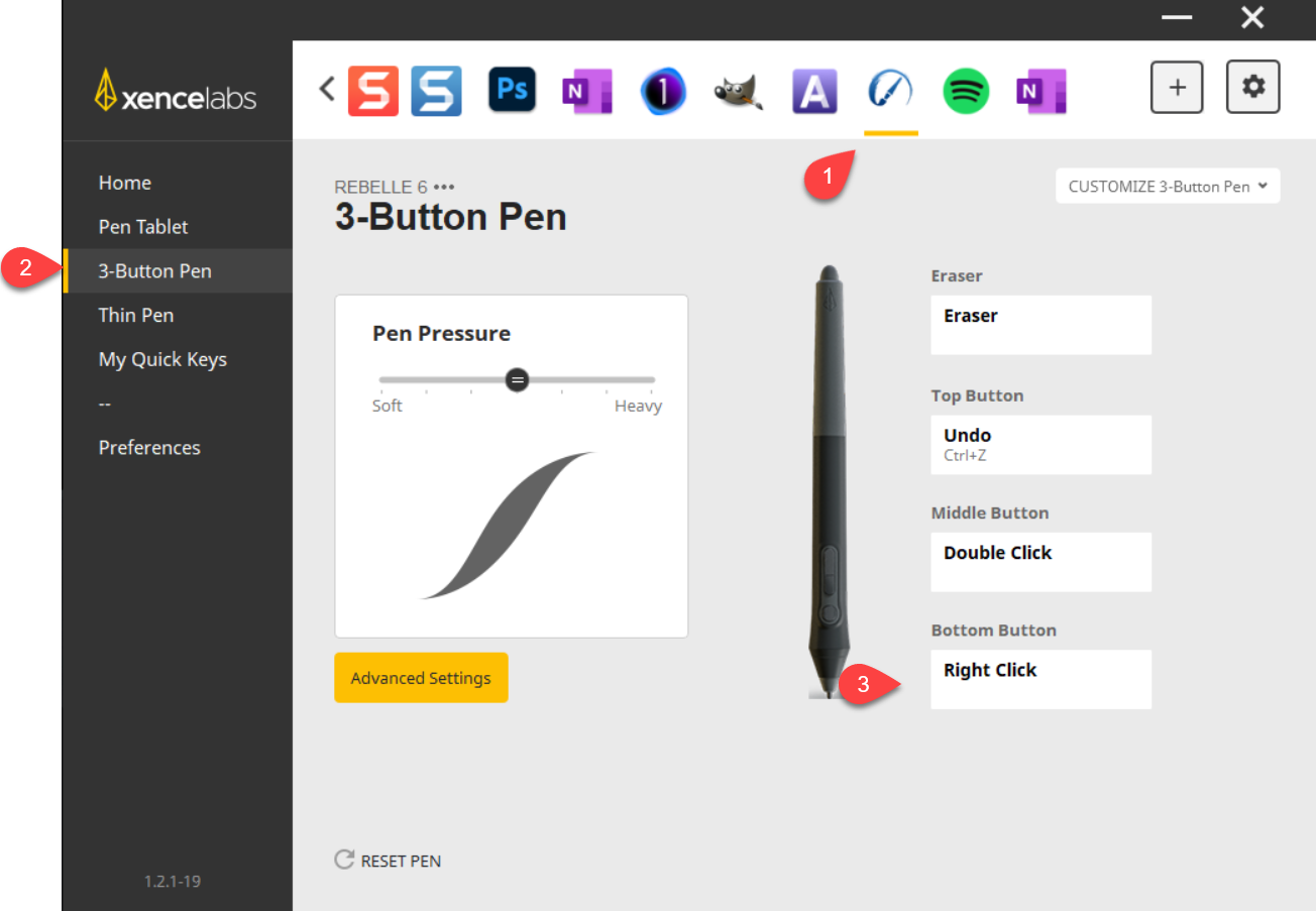 [1] Rebelle 6 で使用するために Precision Mode を設定しています。 [2] 3 ボタン ペンに割り当てます。 [3] 下のスイッチを使用します。 | ![]() |